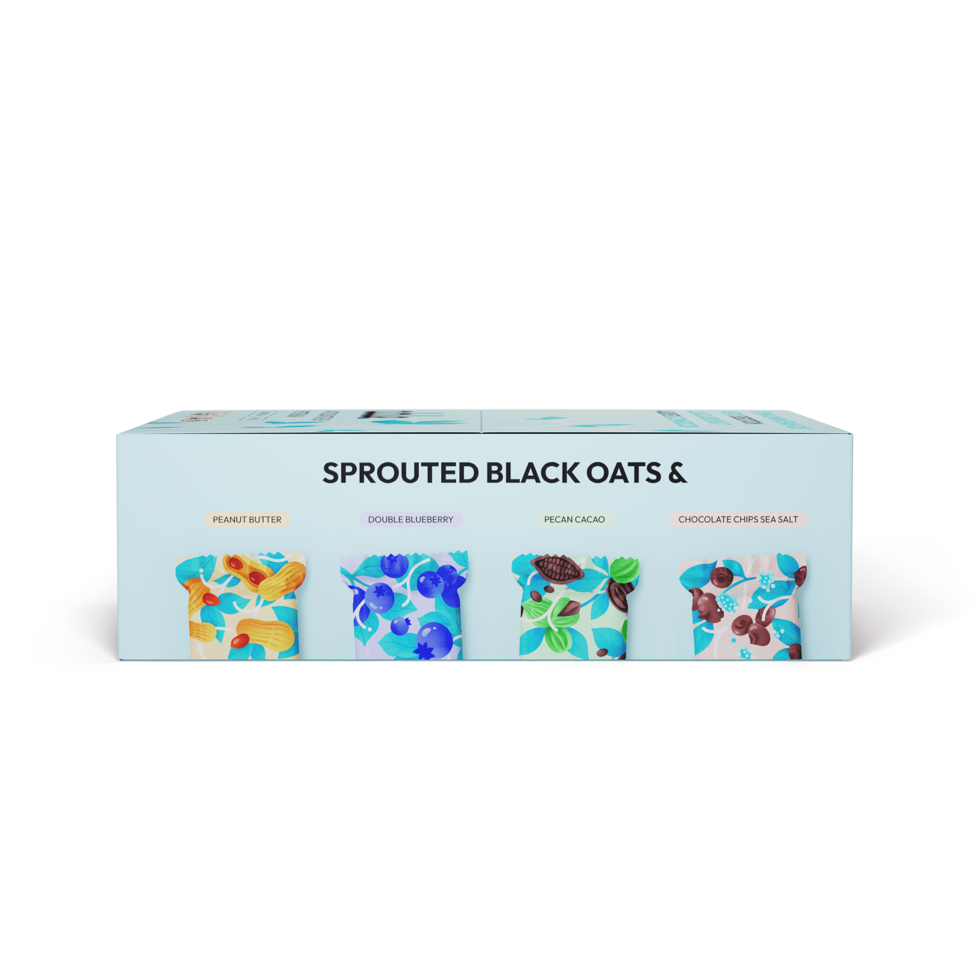 Explore all flavors at once with our Variety Pack, featuring 3 bars of each of our signature flavors: Double Blueberry, Peanut Butter, Pecan Cacao, and Chocolate Chip Sea Salt. It's the ideal way to taste and enjoy the diversity of our delicious protein bars powered by Organic Sprouted Black Oats.